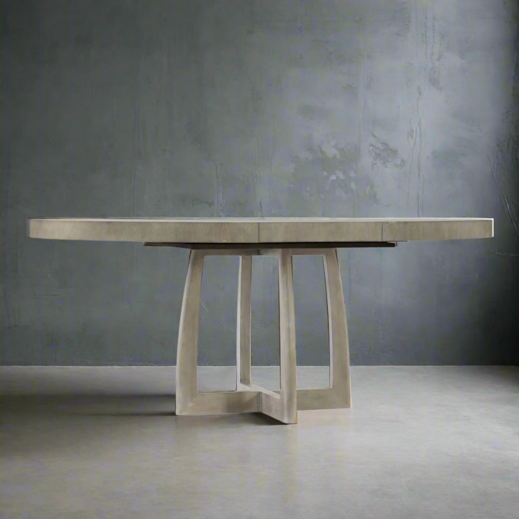 Experience inviting elegance with the Affinity 48-inch Round Dining Table—a soft, rounded form adorned with wire-brushed greige and antique white finishes on quartered White Oak.