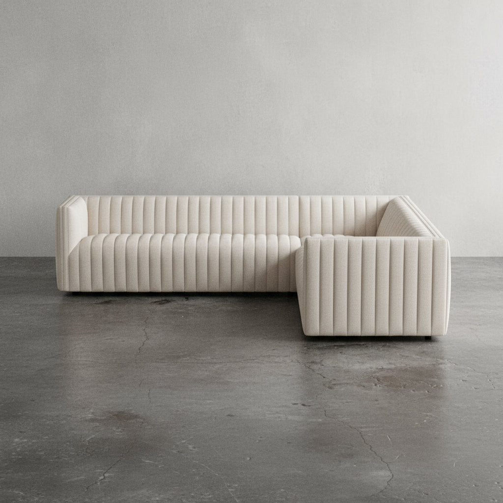 The Augustine 3-Piece Sectional brings contemporary elegance and sumptuous comfort to your larger living spaces. With its dramatically channeled design, this sectional offers a crisp and clean look that complements modern decor. Crafted for both style and endurance, it features performance fabrics and grain leather specially designed to withstand spills, stains, high traffic, and wear, ensuring long-term comfort and unparalleled durability.