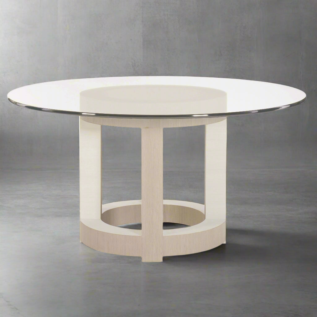 With a clean, modern form and combination of finishes, the Axiom round dining table offers glamorous transitional style and unique visual appeal. In this sleek, geometric design, a round glass top with an eased edge rests on an open circular base with four leg posts. On the base, engineered faux anigre veneers are presented in two silky, low-sheen finishes that work together to create texture and depth. The result of fine craftsmanship, this piece delivers contemporary elegance with a warm and inviting feel.