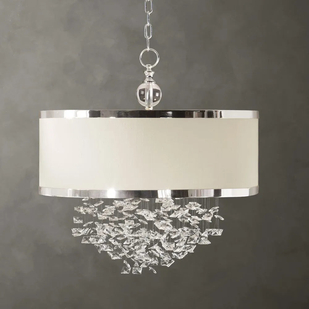 The classic appeal of crystal is updated for today's sophisticated tastes, with free-falling crystals and a silver-trimmed, antique white linen drum shade. 3-100 watt max, Edison sockets. Bulbs not included. Supplied with 15' wire and 7' chain for adjustable installation.
