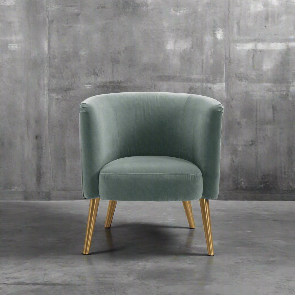 Description: The Haider Accent Chair in Slate Blue is the epitome of style and comfort. This stylish barrel chair is designed to make a statement with its plush diamond button tufted exterior, upholstered in luxurious slate blue velvet. The chair is lined with antique brass nailhead trim, adding a touch of sophistication to its design. It stands on metal tapered dowel legs finished in brushed brass, combining both form and function seamlessly.