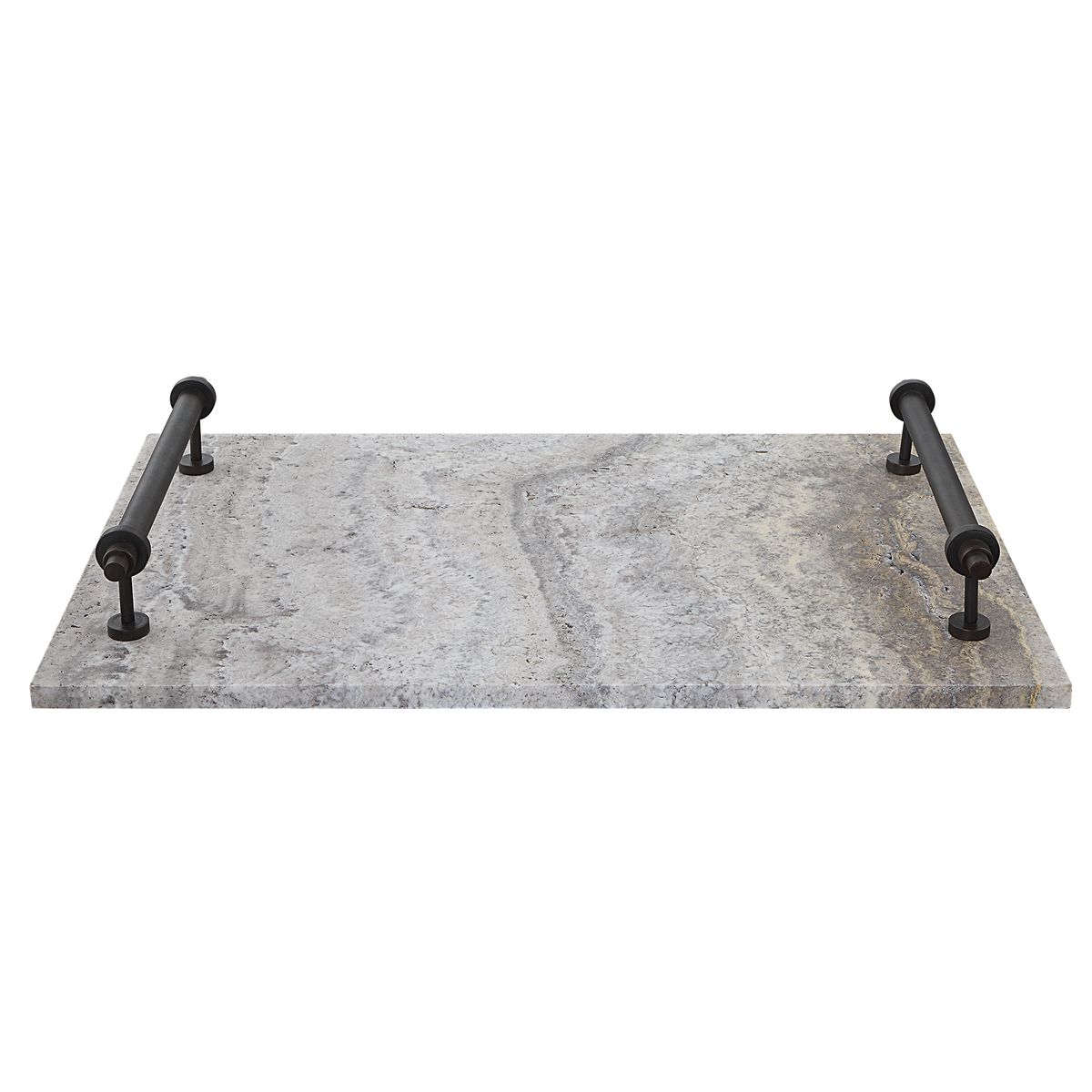 The Montana Tray showcases the clean expanse of gray travertine, then adds a rustic flare with steel handles finished in an acid-etched bronze. Creating displays of your favorite objects, or organizing spices and oils in a centralized location, are just a few of its many uses. Due to the porous characteristics of this natural stone, acidic items and constant moisture should be avoided.