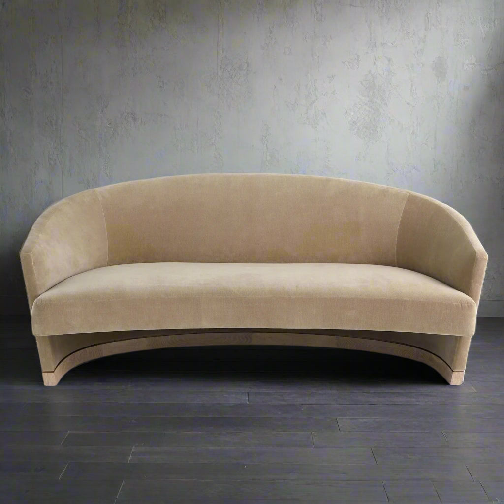 Elegant and sophisticated, the Ophelia demi-lune loveseat boasts graceful curves and soft lines.The piece rests softly on a white oak base, set apart from the expertly tailored 100% cotton velvet frame by an inset bronze reveal. The cantilevered seat offers a remarkable and deceptively comfortable perch. The rear of the sofa is gently rounded, making this piece a stand-out either against a wall or floated in a space.