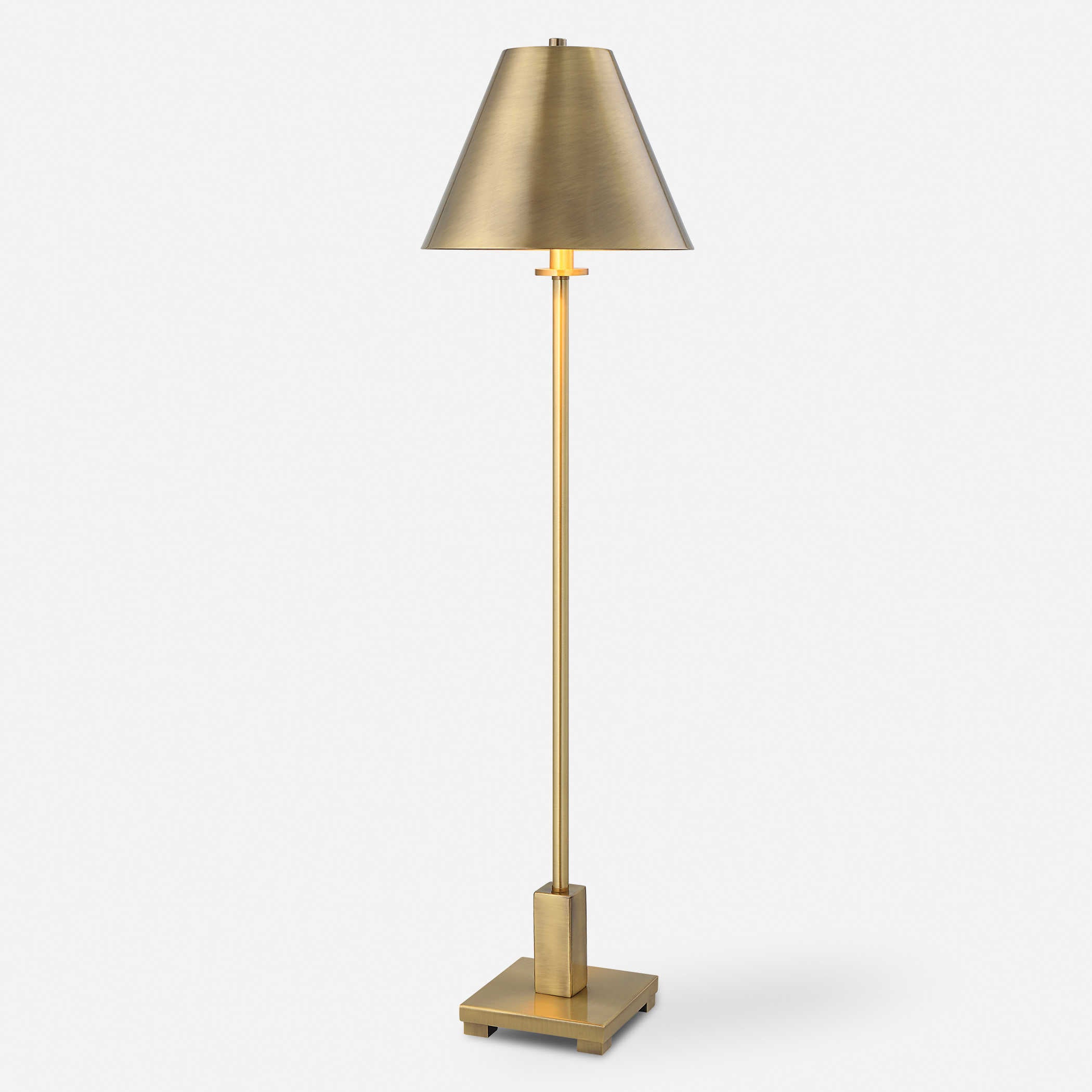 The Pilot Buffet Lamp displays a slender metal construction finished in plated brushed brass with a coordinating metal empire shade.