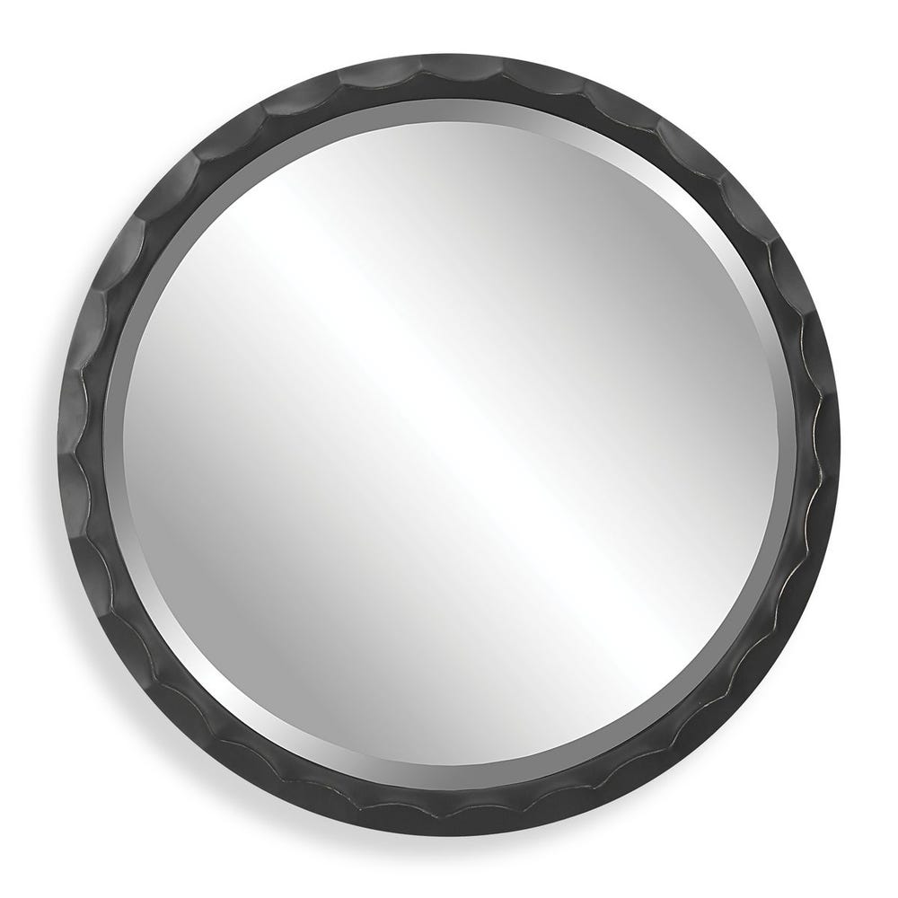 This round mirror showcases a molded frame with a unique scalloped motif finished in a lightly rubbed aged black with subtle silver undertones. Mirror has a 1 1/4" bevel.