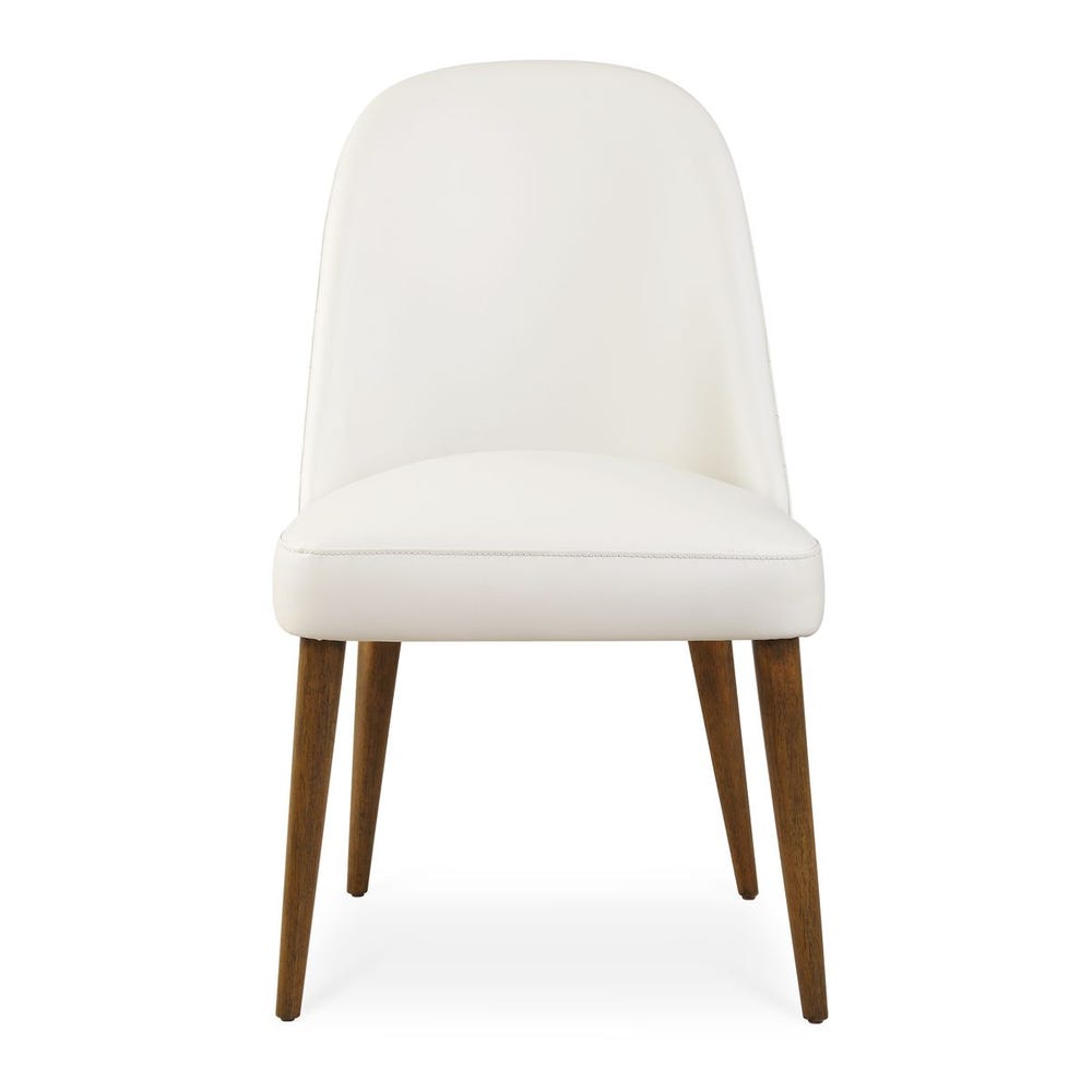 Stunning from all angles, the Stitches dining chair features a diamond tufted back upholstered in rich ecru pebbled faux leather that are encapsulated by oak legs in warm walnut.